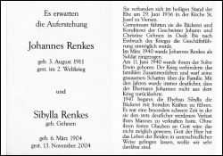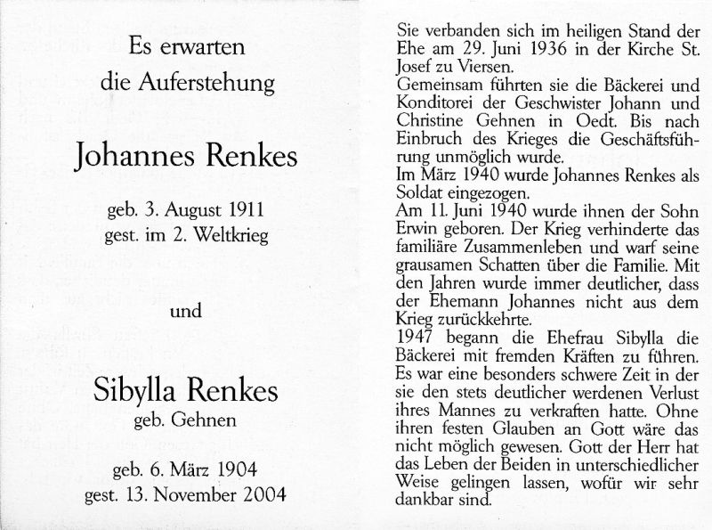 Opfer 2. Weltkrieg: nicht aus Krieg zurückgekehrt; ∞ 29.6.1936 in Viersen Sibylla Gehnen; führten Bäckerei der Geschw. Johann u. Christine Gehnen in Oedt; 1940 Soldat; 11.6.1940 Sohn Erwin geboren |