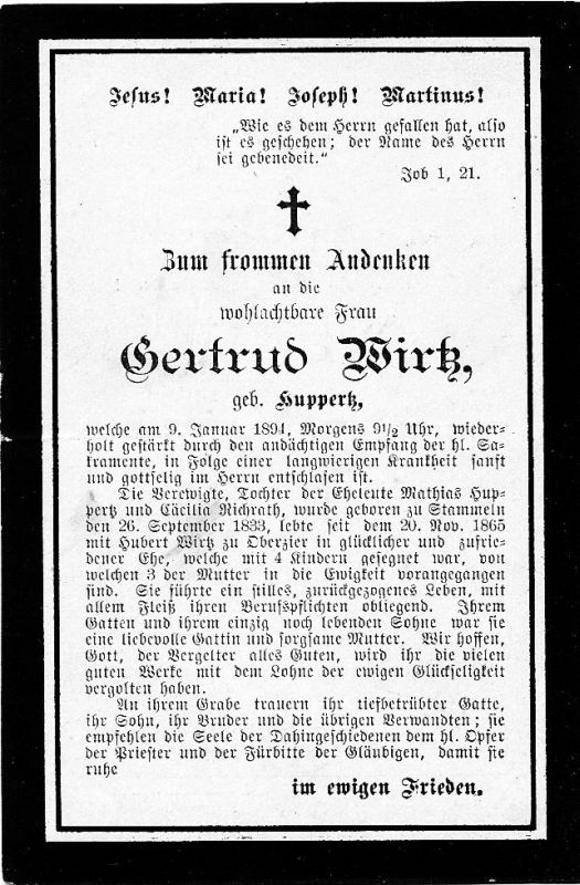 | Eltern: Mathias Huppertz u. Cäcilia geb. Richrath; ∞ 20.11.1865 Hubert Wirtz zu Oberzier; 4 K., davon 3 †; |