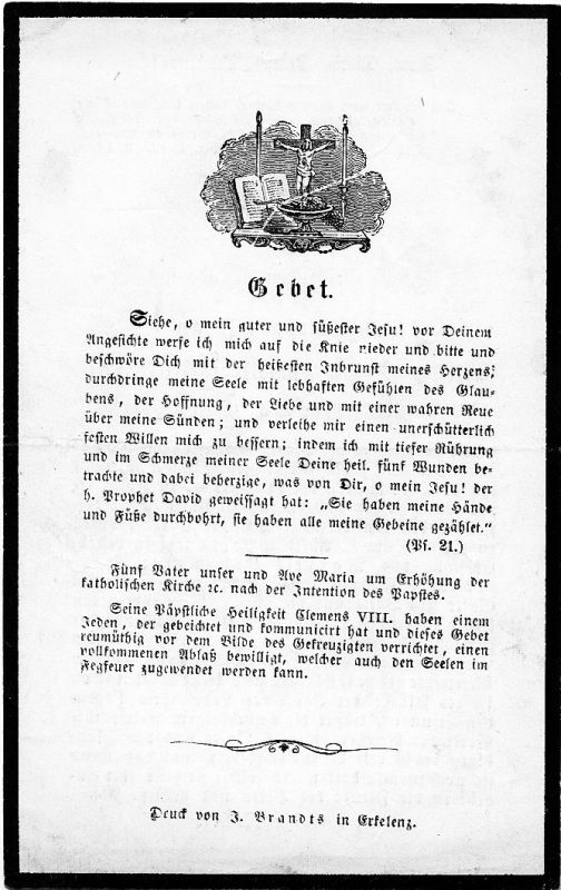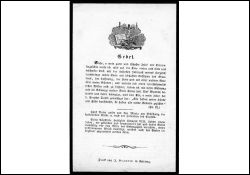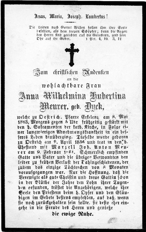 | Totenzettel-Nr.: | 4972 |  | Name: | Meurer, geb. Dyck |  | Vorname: | Anna Wilhelma Hubertina |  | Geburtsort: | Oestrich |  | Geburtsdatum: | 09.04.1836 |  | Sterbeort: | Oestrich, Pfarrer Erkelenz |  | Sterbedatum: | 08.05.1863 |  | Bearbeiter: | Josef Wißkirchen |  | Sammlung: | Josef Wißkirchen, Stommeln |  | Sonstiges: |  | ∞ 9.2.1861 Marzell Joh. Anton Meurer; 1 Tochter von 8 Monaten; langwierige Abnehmungskrankheit |  |
