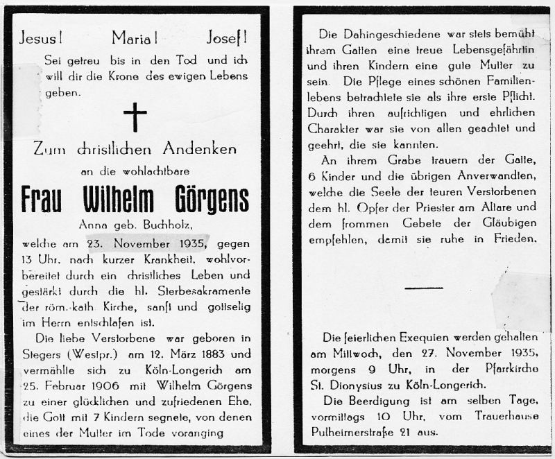 | ∞ 25.2.1906 in Köln-Longerich Wilhelm Görgens; 7 Kinder, davon 1 verstorben |