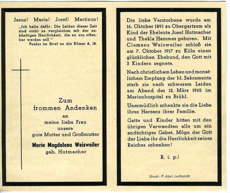 | Eltern: Josef Hutmacher und Thekla, geb Hammes; ∞ Clemens Weisweiler |