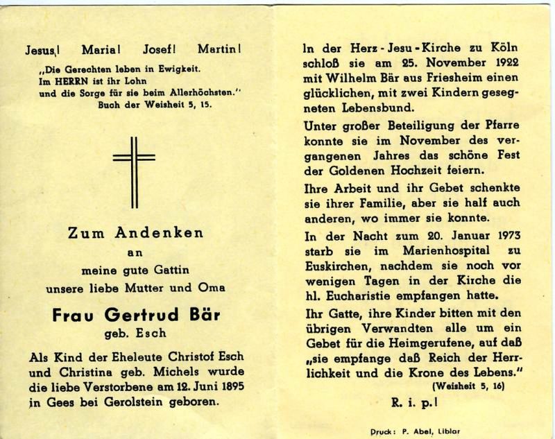 Eltern: Christopf Esch und Christina, geb Michels; ∞ Wilhelm Bär |