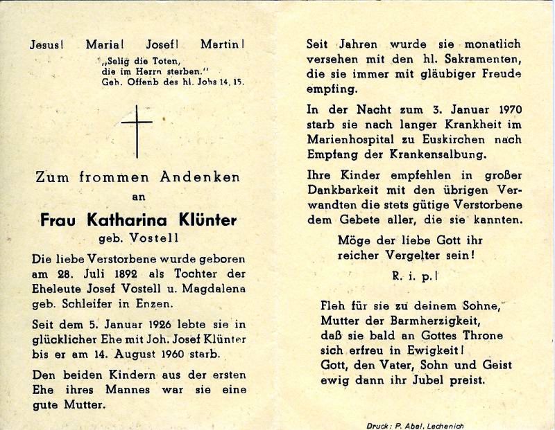 Eltern: Josef Vostell und Magdalene, geb Schleifer; ∞ Joh Josef Klünter |