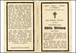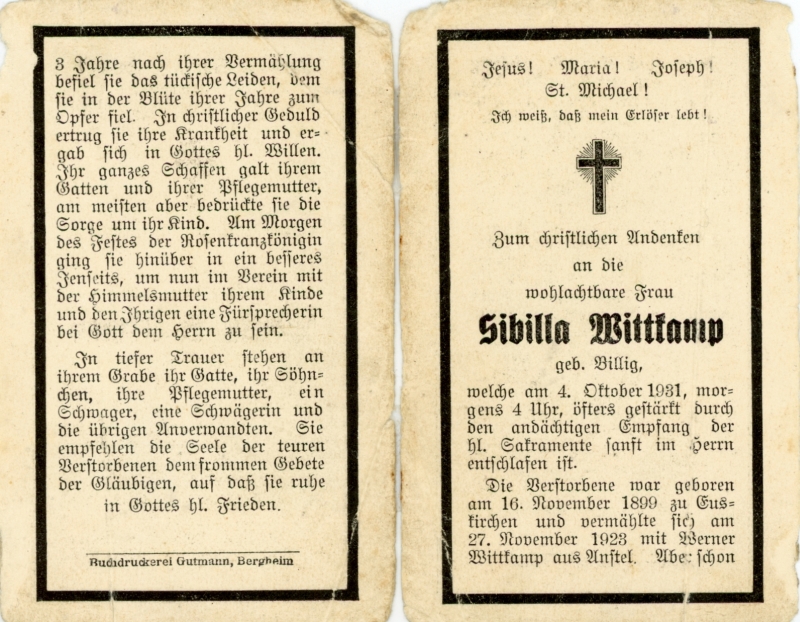 ∞ 27.11.1023 Werner Wittkamp aus Anstel; 3 J. später befiel sie eine tückische Krankheit; 1 K.; Druck in Bergheim |