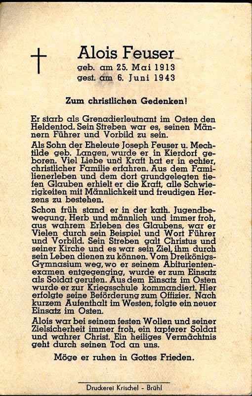 Gefallener 2. Weltkrieg; Grenadierleutnant; Eltern: Joseph Feuser und Mechtilde Feuser, geb. Langen |