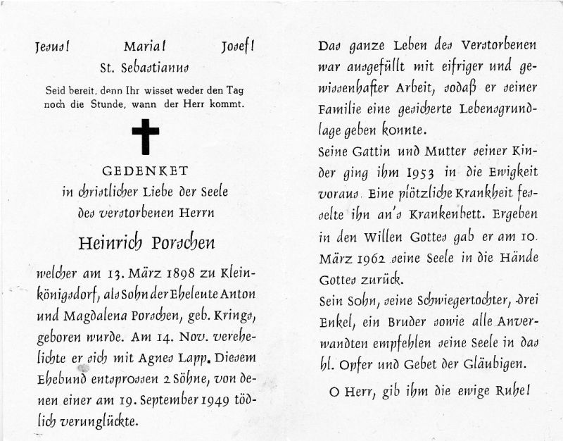 Eltern: Anton Porschen u. Magdalena geb. Krings; ∞ 14.11. Agnes Lapp, † 1953; 2 Söhne, davon 1 19.9.1949 tödlich verunglückt |