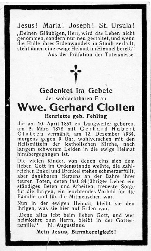 ∞ 3.3.1878 Gerhard Hubert Clotten; langes, schweres Leiden; viele Kinder, 1 im Ordensstand |