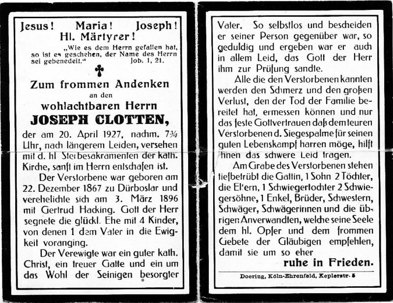 ∞ 3.3.1896 Gertrud Hacking; 4 K., davon 1 †; 3 überlebende Kinder (Eltern: Gerhard Hubert Clotten u. M. C. geb. Gottschalk) |