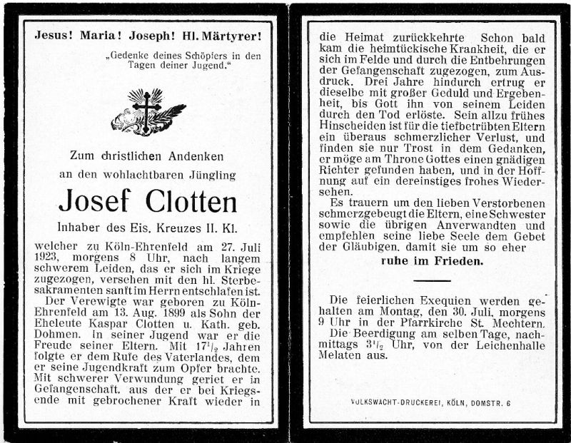 Eltern: Kaspar Clotten u. Katharina geb. Dohmen; mit 17 1/2 J. folgte er Ruf d. Vaterlandes, schwer verwundet, mit gebrochener Kraft Rückkehr aus Gefangenschaft; daraus 3 J. langes Leiden (Opfer 1. Weltkrieg) |