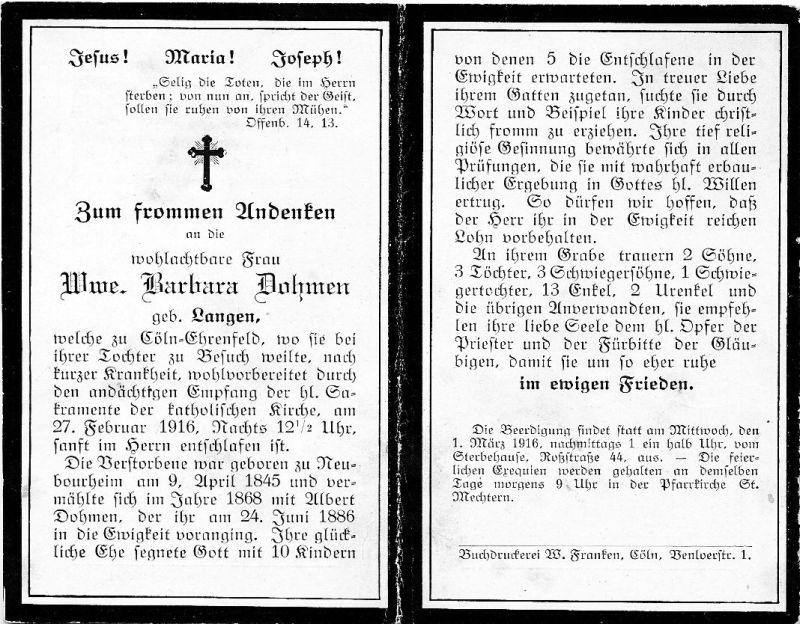 ∞ 1868 Albert Dohmen, † 24.6.1886; 10 K., davon 5 †; bei Besuch in Köln-Ehrenfeld verstorben |