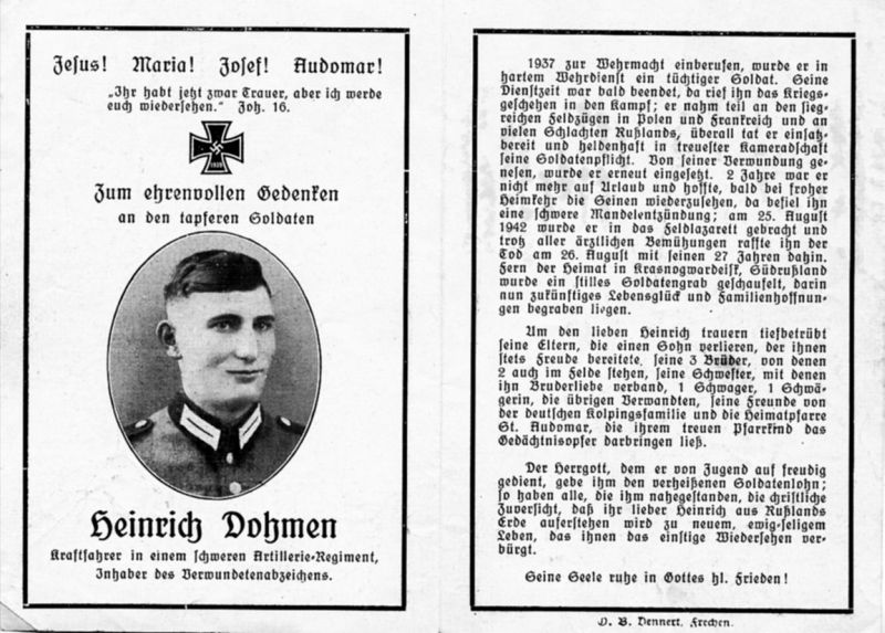Gefallener 2. Weltkrieg; aus Frechen; 1937 zur Wehrmacht einberufen; Teilnahme an Kämpfen in Polen, Frankreich, Rußland; 25.8.1942 mit schwerer Mandelentzündung in Lazarett; Grab in Krasnogwardeisk |