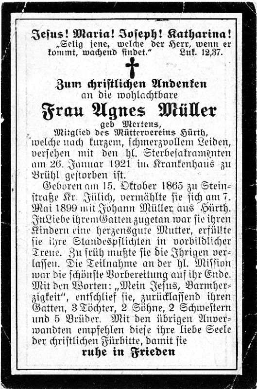 Mitgl. d. Müttervereins Hürth; ∞ 7.5.1899 Johann Müller aus Hürth; 5 überlebende Kinder |