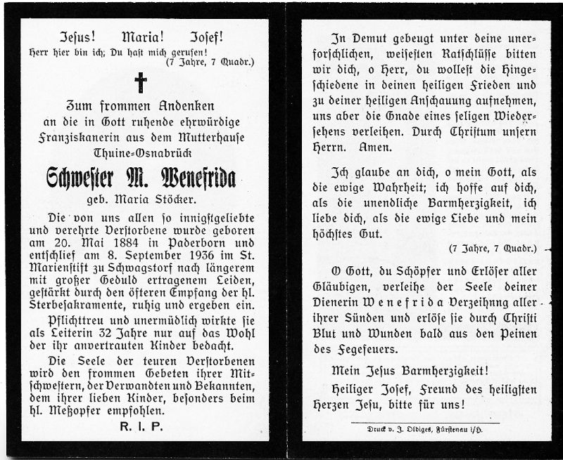 Ordensschwester: Franziskanerin; 32 J. Leiterin des St. Marienstiftes zu Schwagstorf; Druck in Fürstenau i.H. |