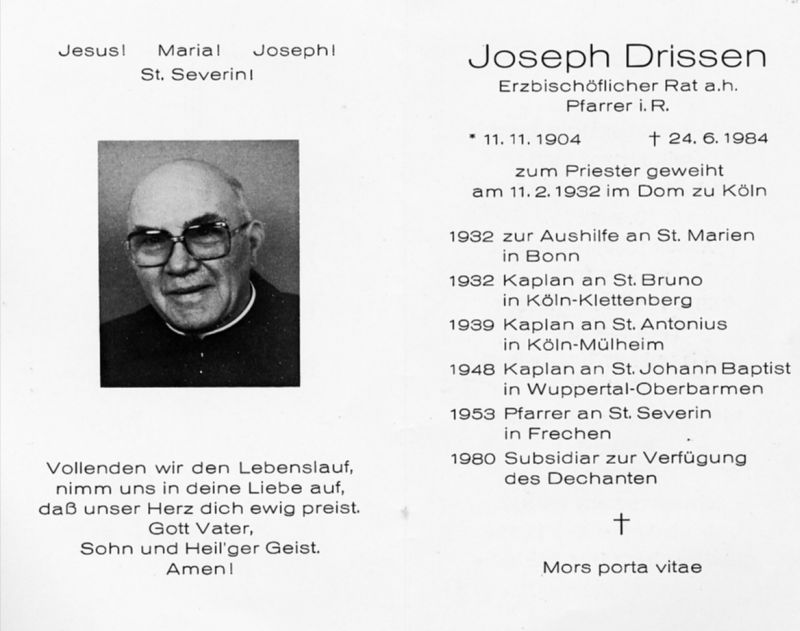 Priesterweihe 11.2.1932 Köln; Kaplan: 1932 Köln-Klettenberg, 1939 Köln-Mülheim, 1948 Wuppertal-Oberbarmen; 1953 Pfarrer an St. Severin in Frechen; 1980 Subsidiar zur Verfügung des Dechanten |