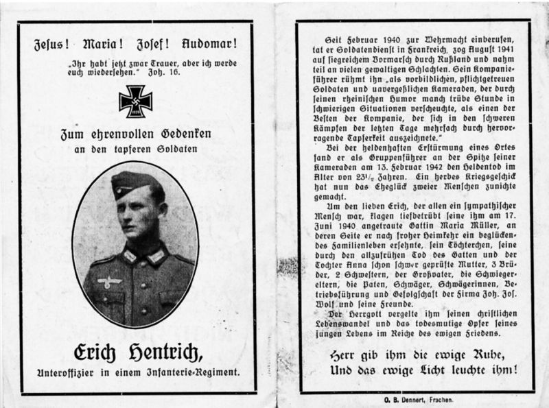 Gefallener 2. Weltkrieg; 23 1/2 J.; ∞ 17.6.1940 Maria Müller; 1 Tochter (Frechen)