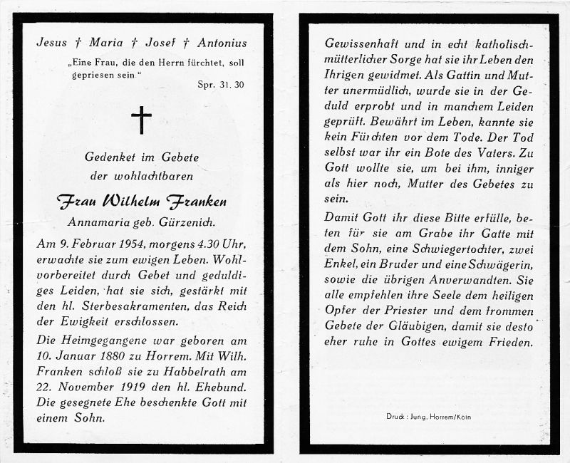 ∞ 22.11.1919 zu Habbelrath Wilhelm Franken; 1 Sohn (Habbelrath) |