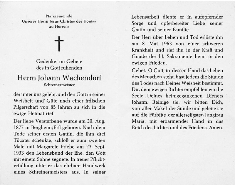 Schreinermeister; 3 Töchter aus 1. Ehe; nach Tod der 1. Frau ∞ 23.9.1933 Margarete Friebe; 1 Sohn; schwere Krankheit (Horrem) |