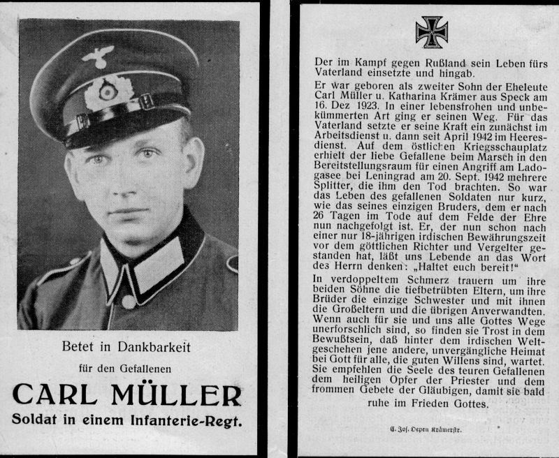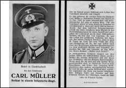Gefallener 2. Weltkrieg; Eltern: Carl Müller u. Katharina geb. Krämer; seit April 1942 im Heeresdienst; sein Bruder war 26 T. vorher gefallen |