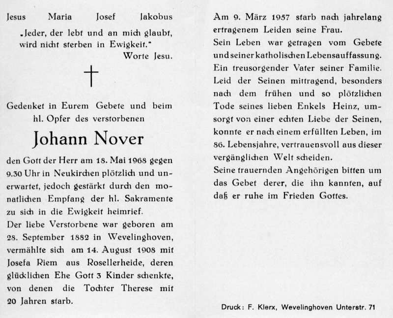 ∞ 14.8.1908 Josefa Riem aus Rosellerheide, † nach langem Leiden 9.3.1957; 3 K.; Tochter Therese † mit 20 J. |