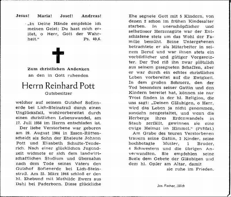 Gutsbesitzer; Tod durch Unglücksfall auf seinem Gutshof; Eltern: Johann Pott u. Elisabeth geb. Schulte-Tenderich; ∞ 25.3.1944 Mathilde Ewers aus Dahl b. Paderborn; 5 K., davon 2 früh † |