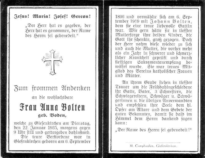 ∞ 6.9.1919 Johann Bolten; 2 K.; seit mehr als 1 J. schwer erkrankt |