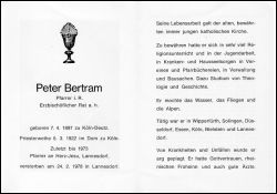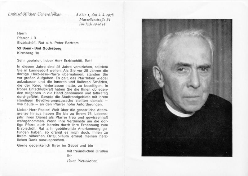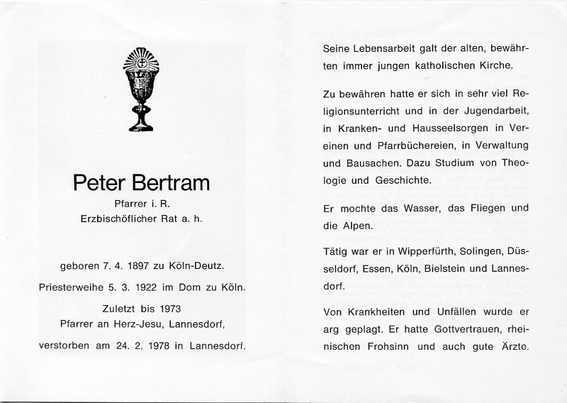 Priesterweihe 7.4.1922 Köln; tätig in Wipperfürth, Solingen, Düsseldorf, Essen, Köln, Bielstein, zuletzt bis 1973 Pfarrer in Lannesdorf |