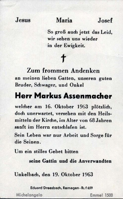 68 J.; Wohnort: Unkelbach; Druck in Remagen