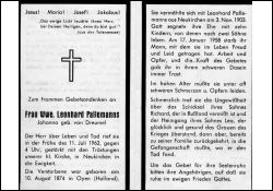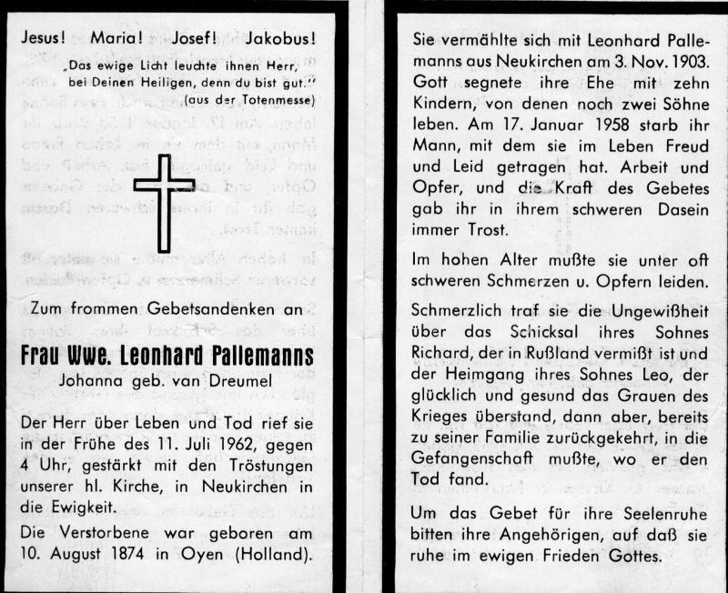 | ∞ 3.11.1903 Leonhard Pallemanns aus Neukirchen, 17.1.1958; 10 K., davon 8 †; Sohn Richard vermißt in Rußland (2. Weltkrieg); Sohn Leo † in Gefangenschaft (Opfer 2. Weltkrieg) |