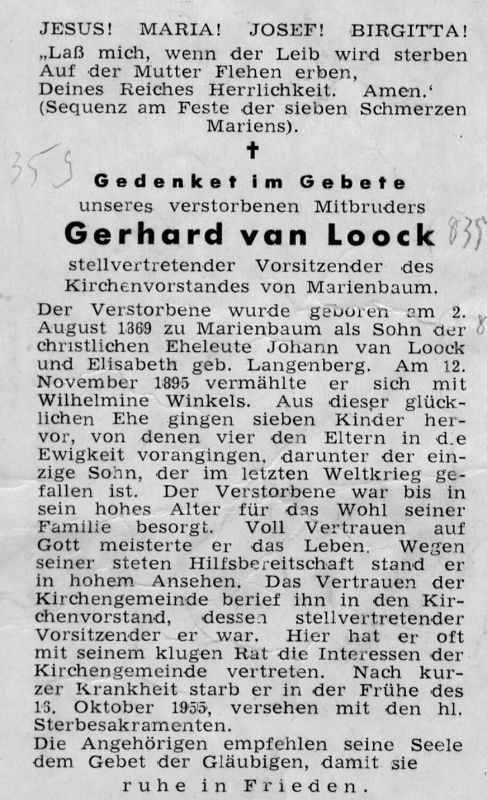 | Stellv. Vors. Kirchenvorstand von Marienbaum; Eltern: Johann van L∞ck u. Elisabeth geb. Langenberg; ∞ 12.11.1895 Wilhelmine Winkels; 7 K., davon 4 †; |