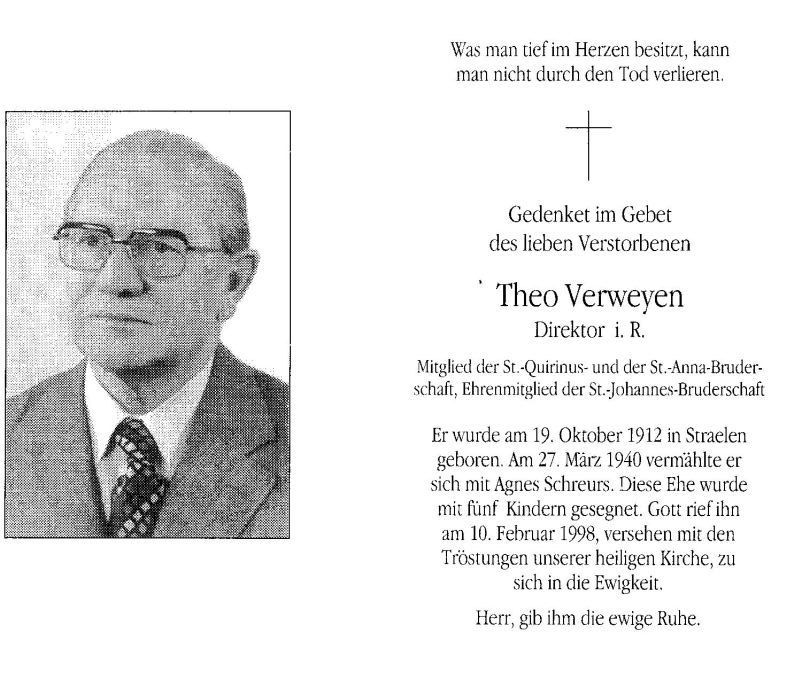 | Direktor i.R.; ∞ 27.3.1940 Agnes Schreurs; 5 K.; Mitgl. St.-Quirinus u. St.-Anna-Bruderschaft; Ehrenmitgl. St.-Johannes-Bruderschaft |