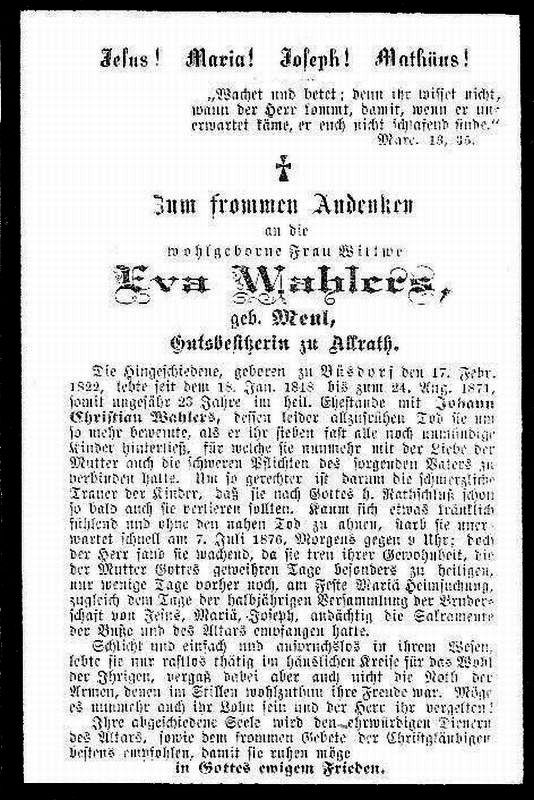 ∞ 18.1.1848 Johann Christian Wahlers, † 24.8.1871; 7 K.; Gutsbesitzerin zu Allrath |