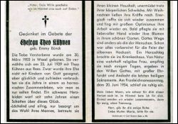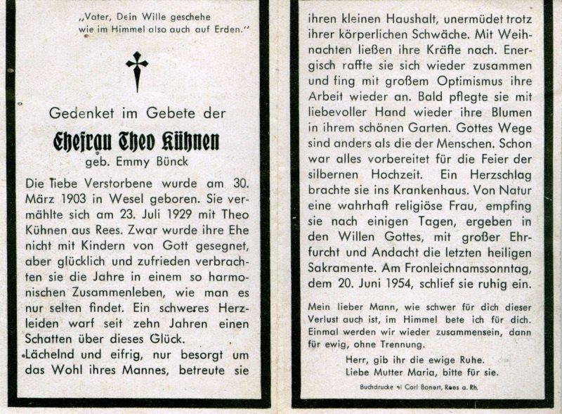 OO 23.7.1929 Theo Kühnen aus Rees; kinderlos; schweres Herzleiden (Druck in Rees) |