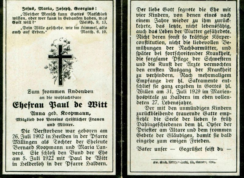 Eltern: Bernard K∞pmann u. Maria geb. Lanvers; OO 5.7.1922 Paul de Witt in Helderloh, Pfarre Haldern; 4 K., davon 2 †; die schwere Geburt des verstorbenen letzten Kindes ließ sie unheilbar erkranken |