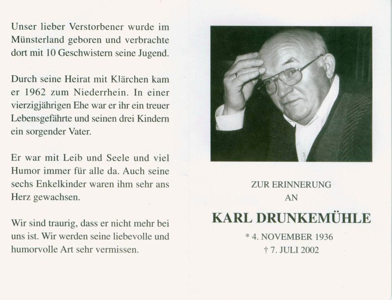 Gebürtig aus dem Münsterland; Heirat mit Klärchen brachte ihn 1962 an den Niederrhein; 40 J. Ehe; 3 K. |