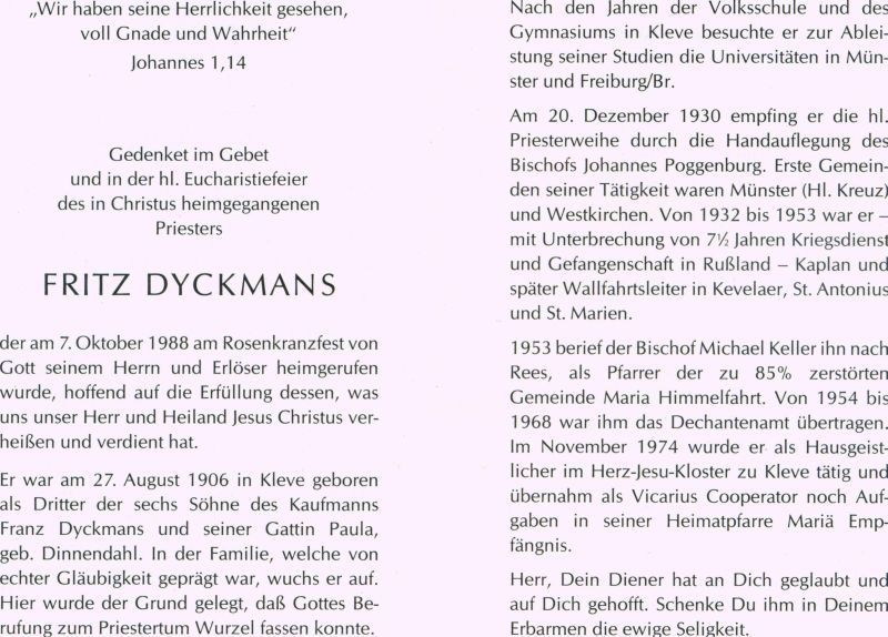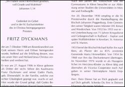Eltern: Kaufmann Franz Dyckmans u. Paula geb. Dinnendahl; Priesterweihe 20.12.1930; tätig zunächst in Münster (Hl. Kreuz) u. Westkirchen; seit 1932 in Kevelaer; 1953 Pfarrer in Rees (Maria Himmelfahrt) |