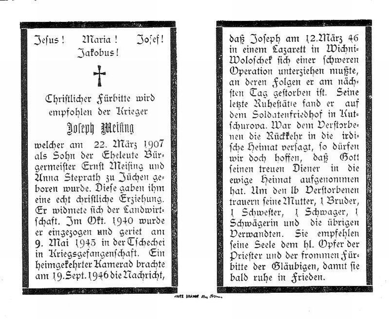 | Opfer 2. Weltkrieg; Eltern: Bürgermeister Ernst Meising u. Anna geb. Steprath; widmete sich d. Landwirtschaft; 9.5.1945 in Tschechei Kriegsgefangenschaft; Tod n. Operation am Tag vorher; Soldatenfriedhof Kutschurova |
