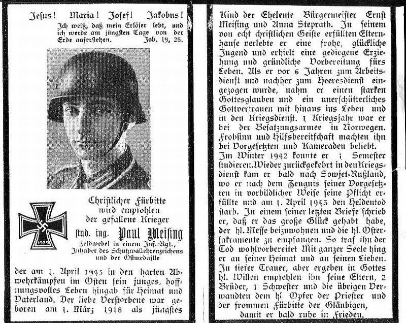 | Gefallener 2. Weltkrieg; Eltern: Bürgerm. Ernst Meising u. Anna geb. Steprath; stud. ing. |