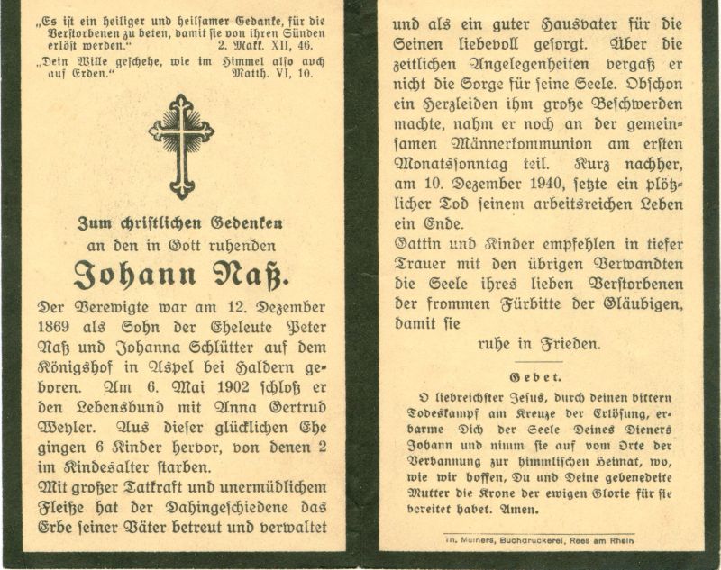 OO 6.5.1902 Anna Gertrud Weyler; 6 K., davon 2 früh †; verwaltete Erbe seiner Väter; Herzleiden (Druck in Rees a. Rh. |