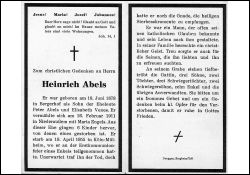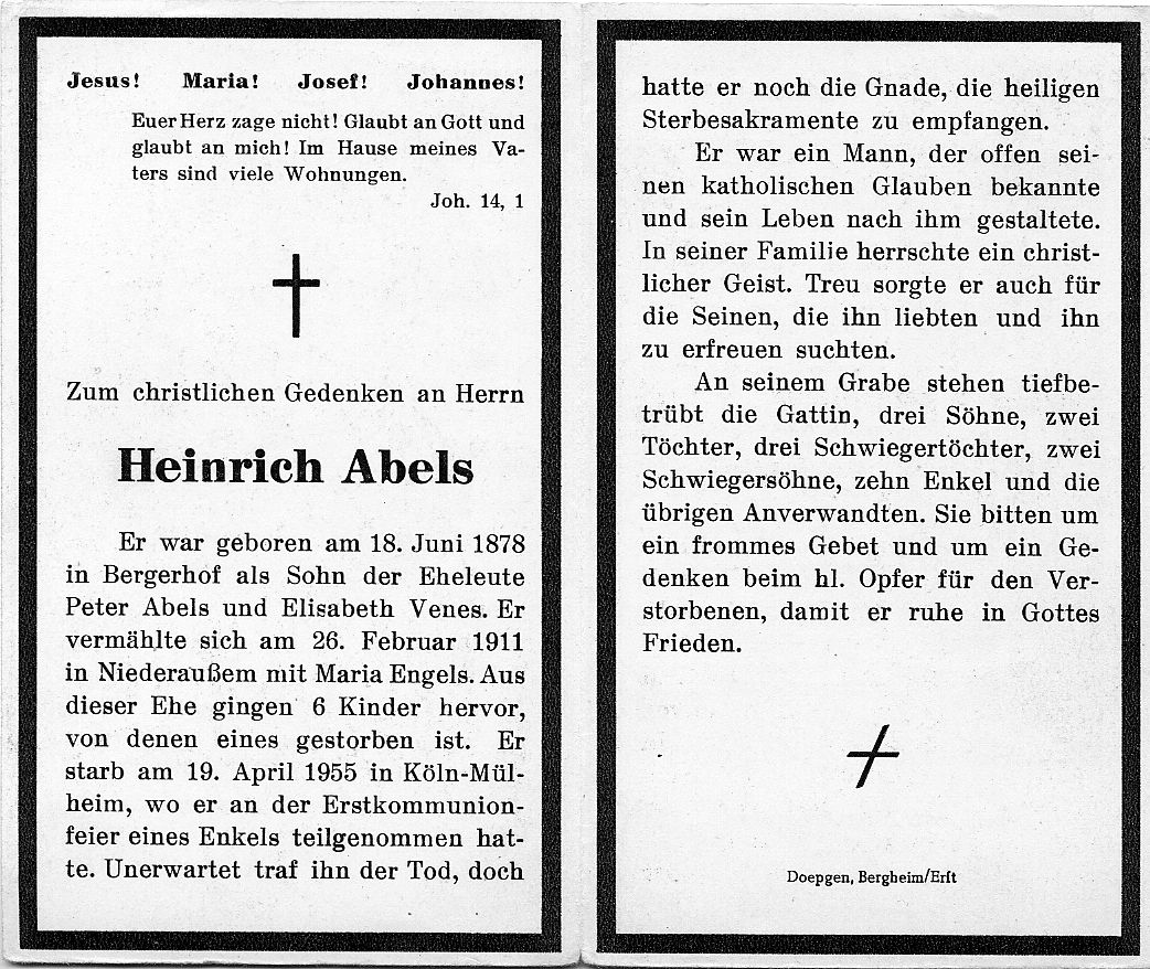 Eltern: Peter Abels u. Elisabeth geb. Venes; ∞ 26.2.1911 in Niederaußem Maria Engels; 6 K., davon 1 †; er starb nach der Teilnahme an der Erstkommunionfeier seines Enkels in Köln-Mülheim (Niederaußem) |