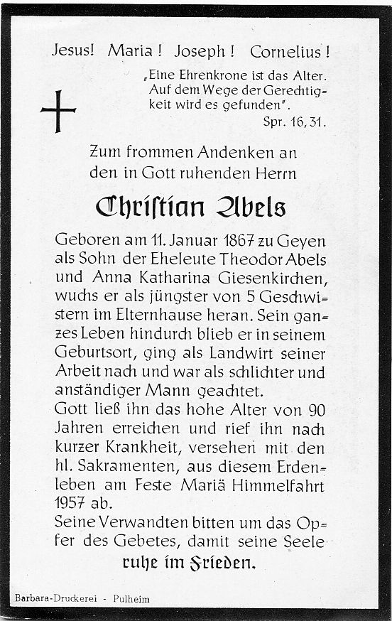 Eltern: Theodor Abels u. Anna Katharina geb. Giesenkirchen; zeitlebens als Landwirt in seinem Geburtsort |