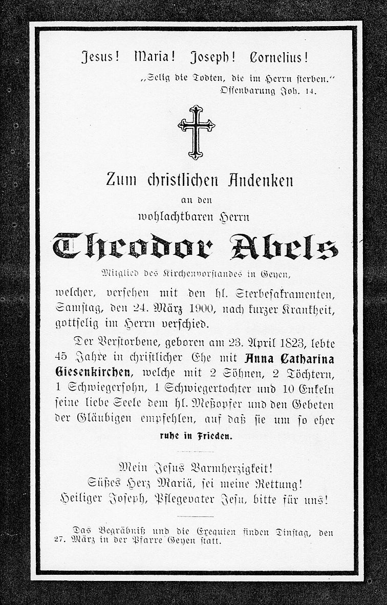 Mitgl. Kirchenvorstand Geyen; 45 J. verh. mit Anna Catharina geb. Giesenkirchen; 4 überlebende Kinder |