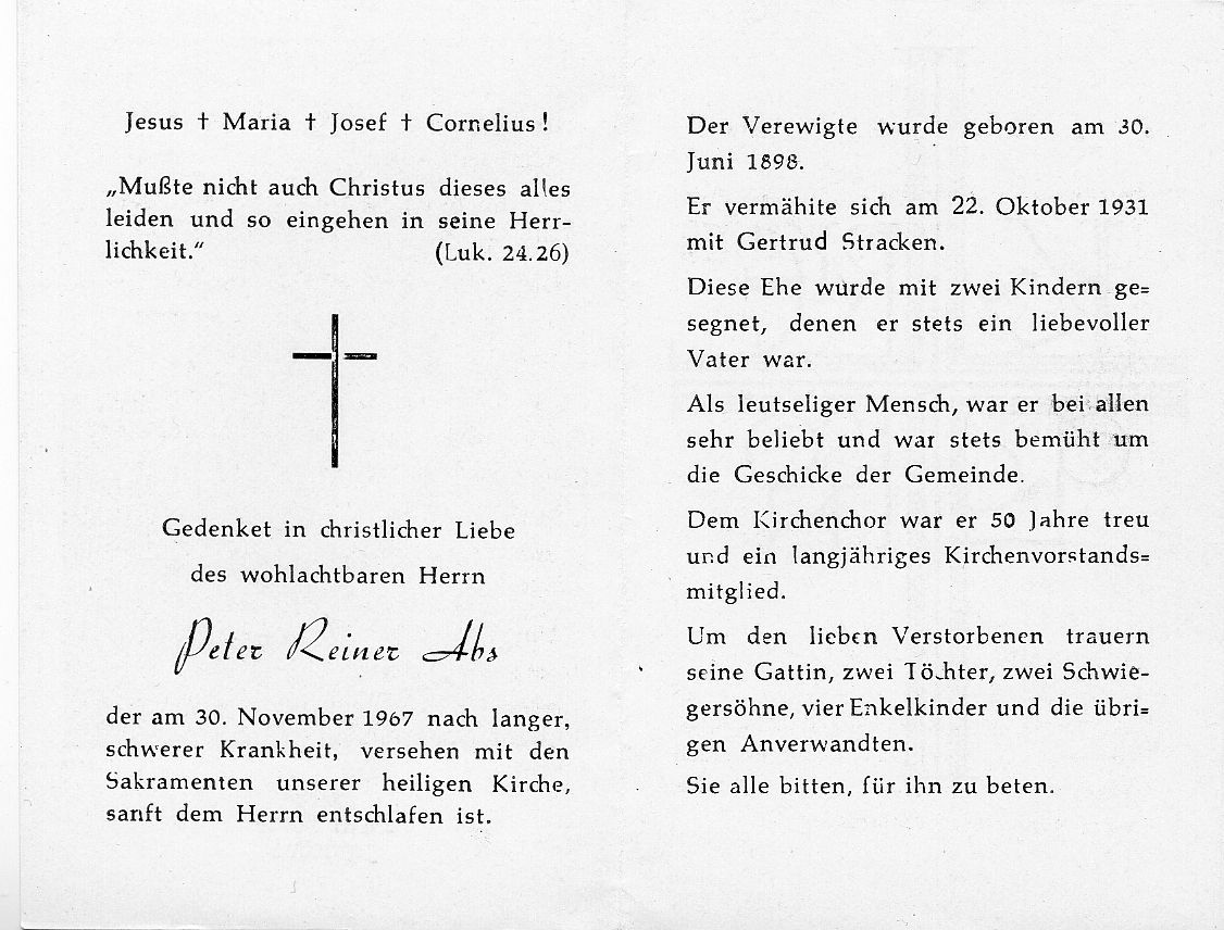∞ 22.10.1931 Gertrud Stracken; 2 K. 50 J. Mitgl. Kirchenchor; Mitgl. Kirchenvorstand (Geyen) |