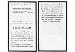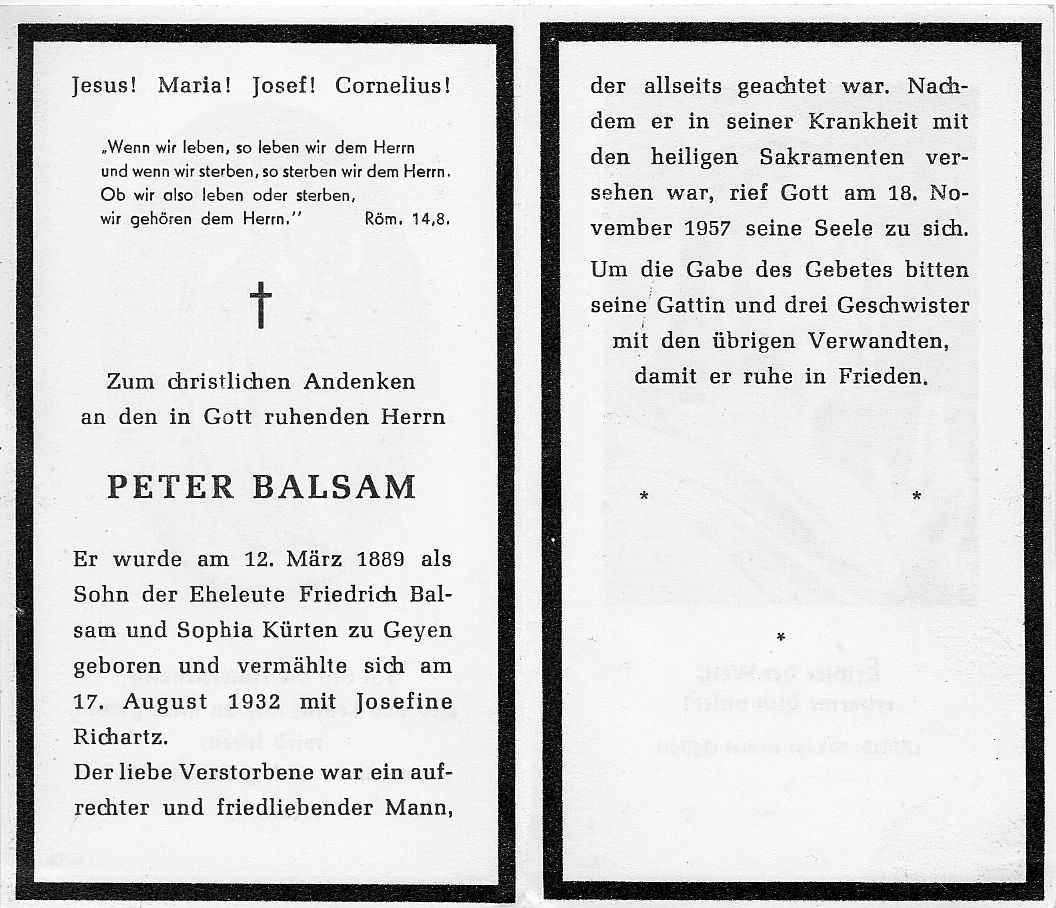 | Totenzettel-Nr.: | 6949 |  | Name: | Balsam |  | Vorname: | Peter |  | Geburtsort: | Geyen |  | Geburtsdatum: | 12.03.1889 |  | Sterbedatum: | 18.11.1957 |  | Bearbeiter: | Josef Wißkirchen |  | Sammlung: | Johannes Nelles, Pulheim-Geyen |  | Sonstiges: |  | Eltern: Friedrich Balsam u. Sophia geb. Kürten; ∞ 17.8.1932 Josefine Richartz (Geyen) |  |