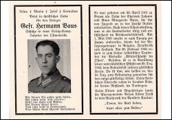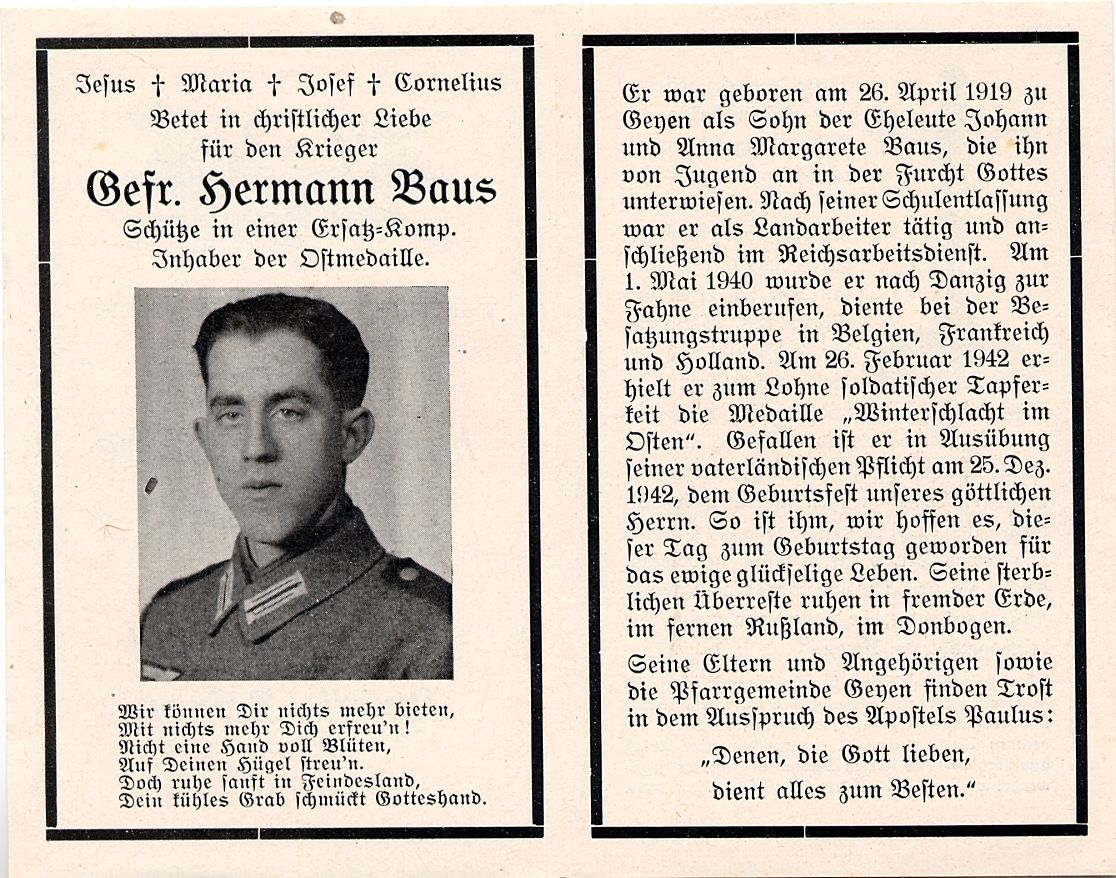 | Gefallener 2. Weltkrieg; Eltern: Johann u. Anna Margarete Baus; Landarbeiter; 1.5.1940 Einberufung (Geyen) |
