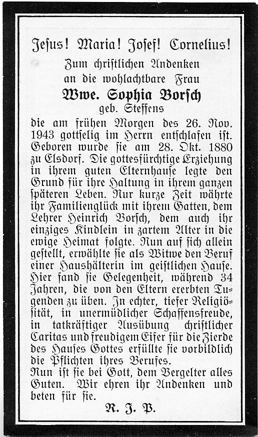 | ∞ Lehrer Heinrich Borsch, bald verstorben; 1 K.; nach dem frühen Tod des Mannes 34 J. Haushälterin im geistlichen Hause (Geyen) |