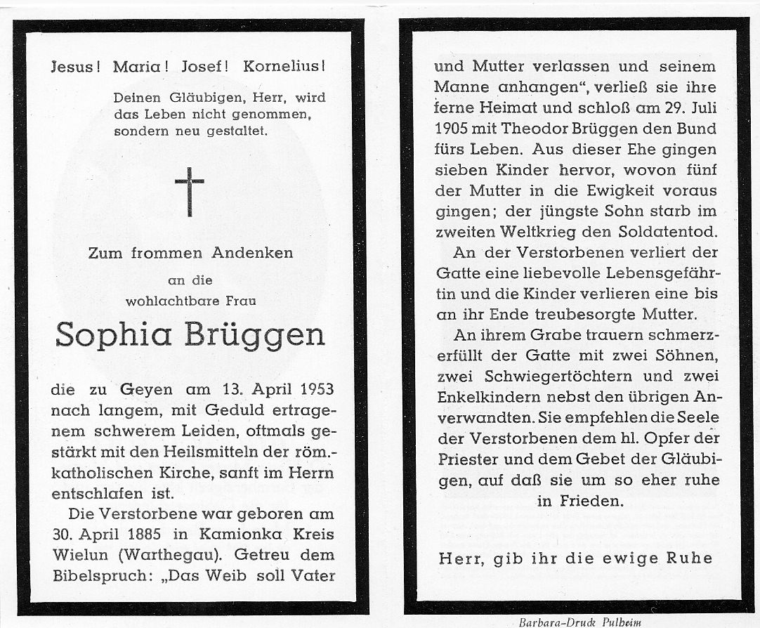 ∞ 29.7.1905 Theodor Brüggen; 7 K., davon 5 †; jüngster Sohn im 2. Weltkrieg gefallen; 2 überlebende Söhne |