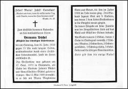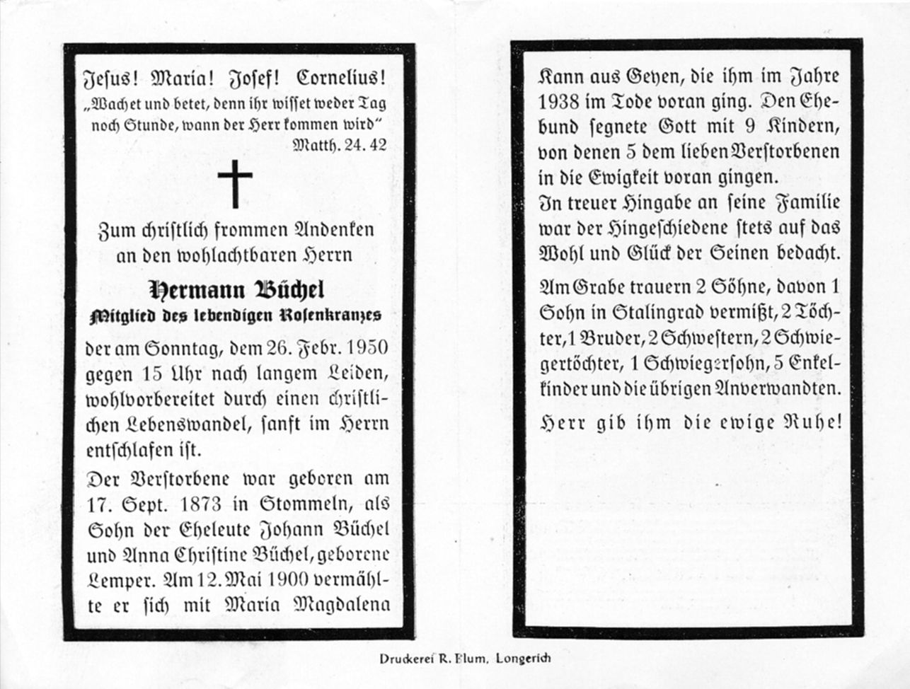 Eltern: Johann Büchel u. Anna Christine geb. Lemper; ∞ 12.5.1900 Maria Magdalena Kann aus Geyen, † 1938; 9 K., davon 5 †; 1 Sohn in Stalingrad (2. Weltkrieg) vermißt (Geyen) |