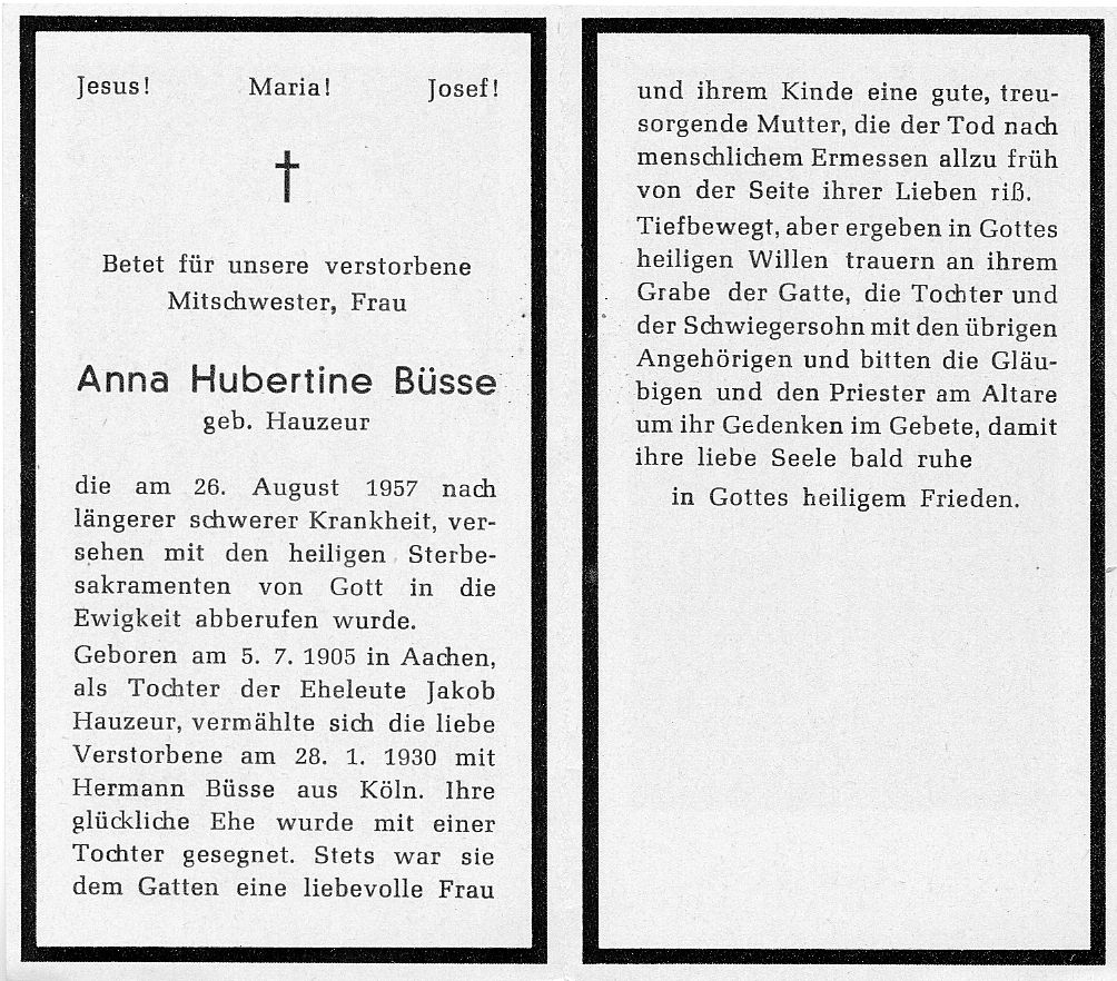 Eltern: Ehel. Jakob Hauzeur; ∞ 28.1.1930 Hermann Büsse aus Köln; 1 Tochter |