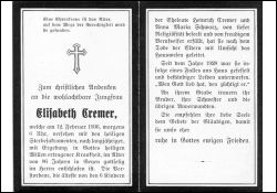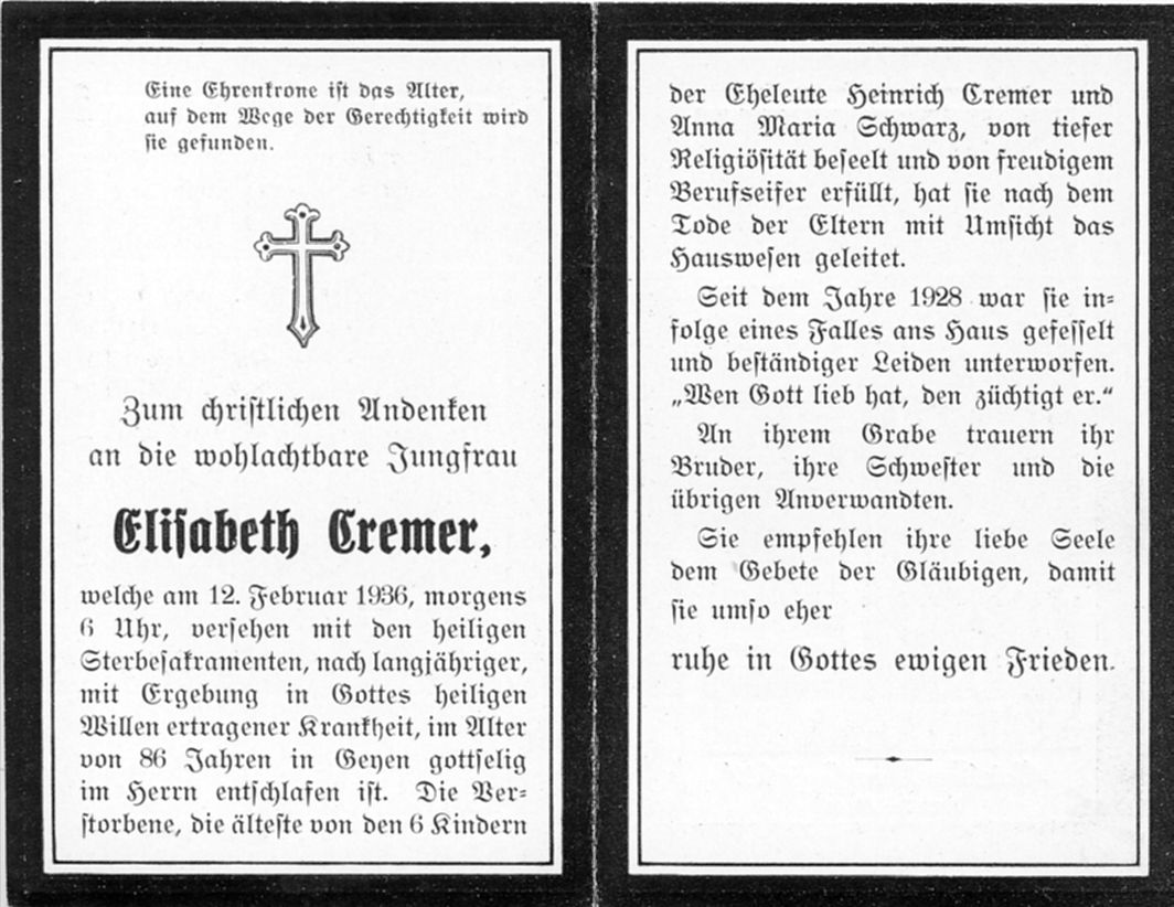 86 J.; Eltern: Heinrich Cremer u. Anna Maria Schwarz; seit 1928 infolge eines Falles ans Haus gefesselt und beständigen Leiden unterworfen (Geyen) |