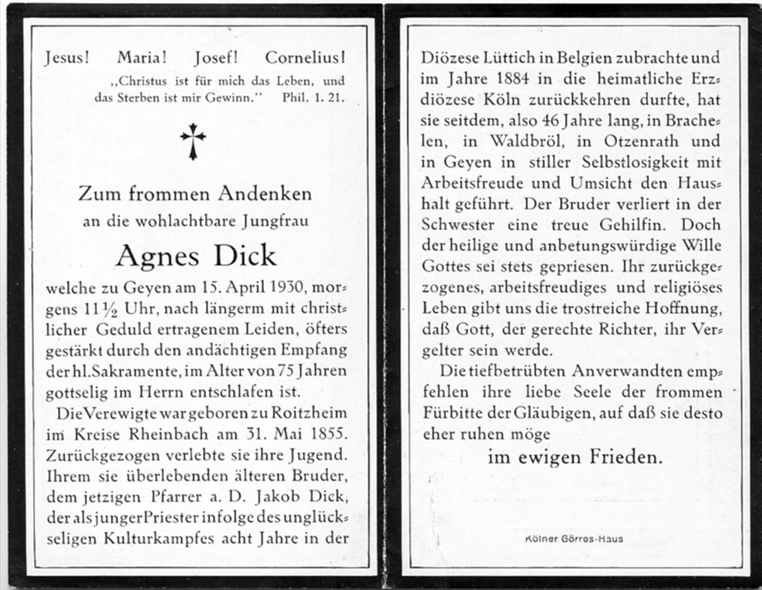 Jungfrau; 75 J.; 46 J. Haushalt ihres geistl. Bruders Jakob Dick geführt, in Brachelen, Waldbröl, Otzenrath u. Geyen; wg. Kulturkampfes war Bruder 8 J. in Diözese Lüttich, Belgien |
